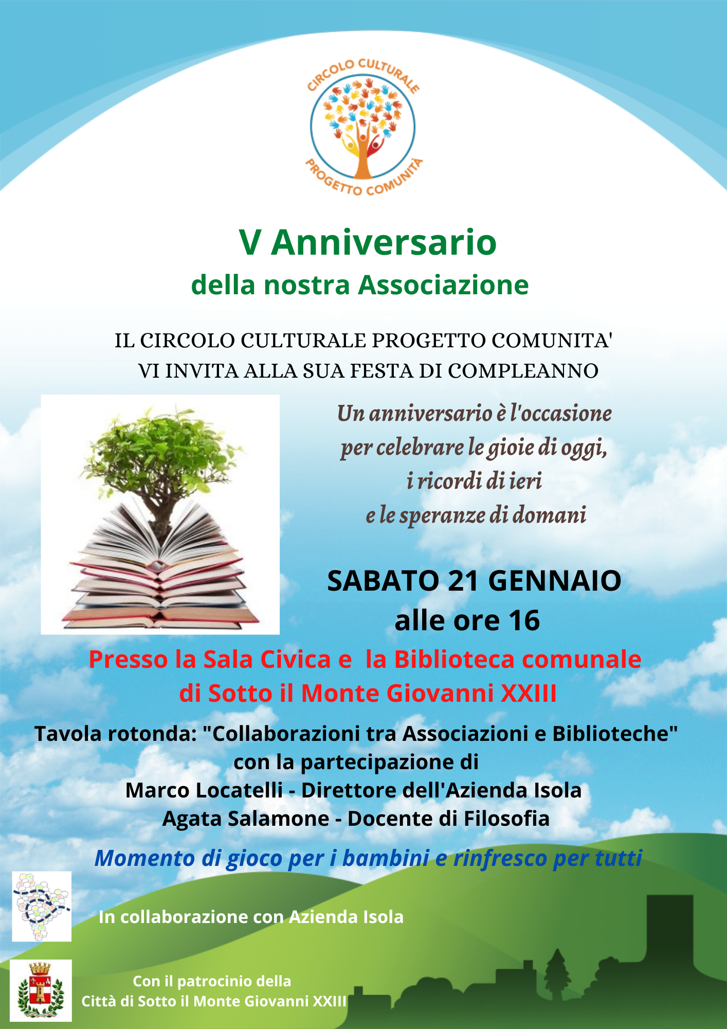 Il Circolo Culturale Progetto Comunità A.P.S. di Sotto il Monte Giovanni XXIII è lieto di invitarvi al 5° anniversario dell'Associazione.