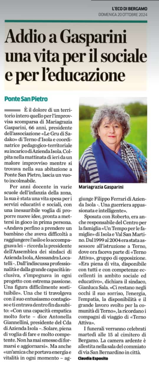 Gentilissimi, il Centro per la famiglia Ambito Isola Bergamasca e Bassa Val San Martino "Un tempo per le famiglie" perde purtroppo la sua anima ispiratrice, Maria Grazia Gasparini.