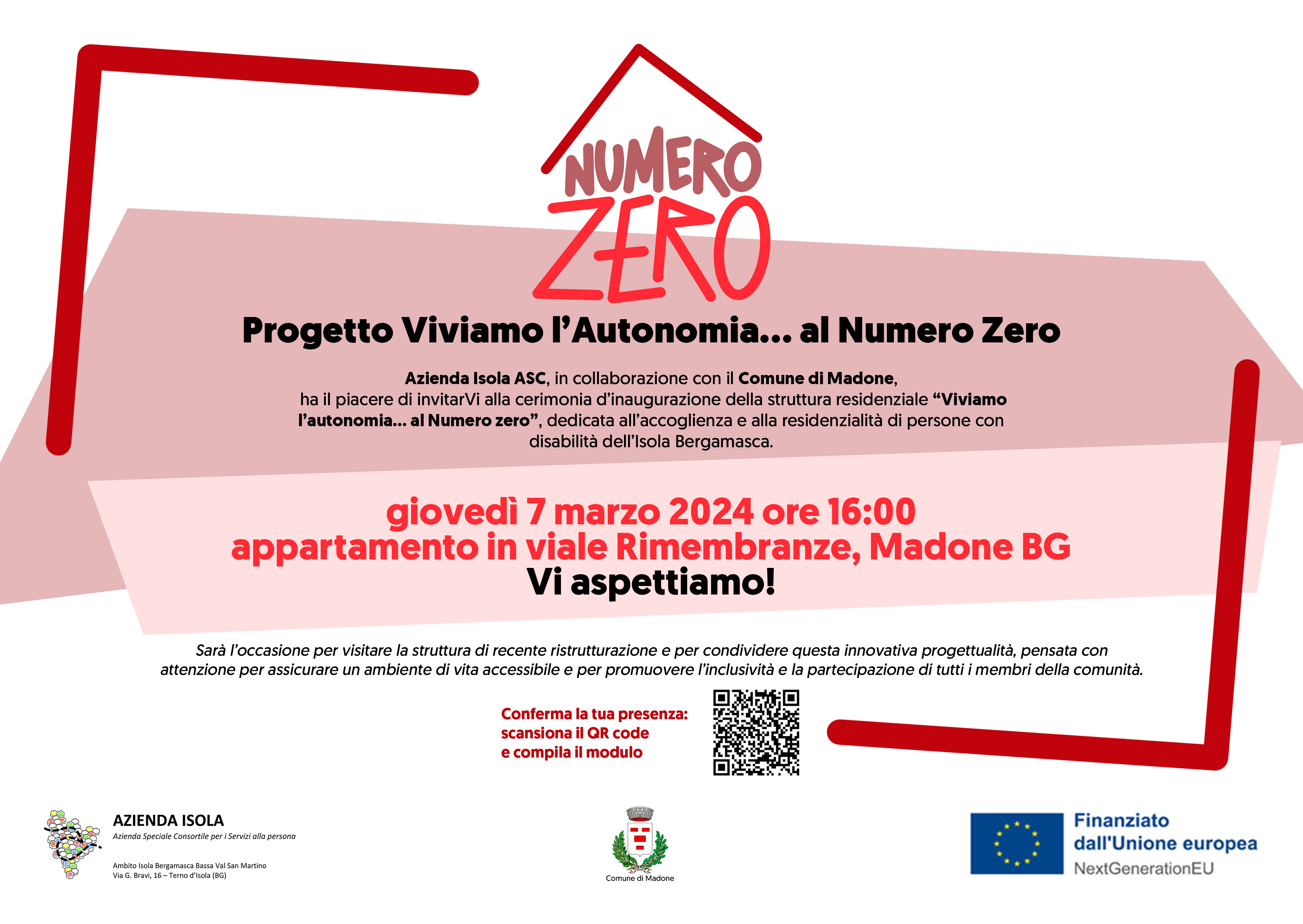 Gentilissime/i, siamo lieti di invitarVi alla cerimonia di inaugurazione del nuovo appartamento sito a Madone (BG) Viale Rimembranze, realizzato nell’ambito del progetto “Viviamo l’autonomia… al Numero Zero” volto a sperimentare percorsi di autonomia abitativa per persone con disabilità.