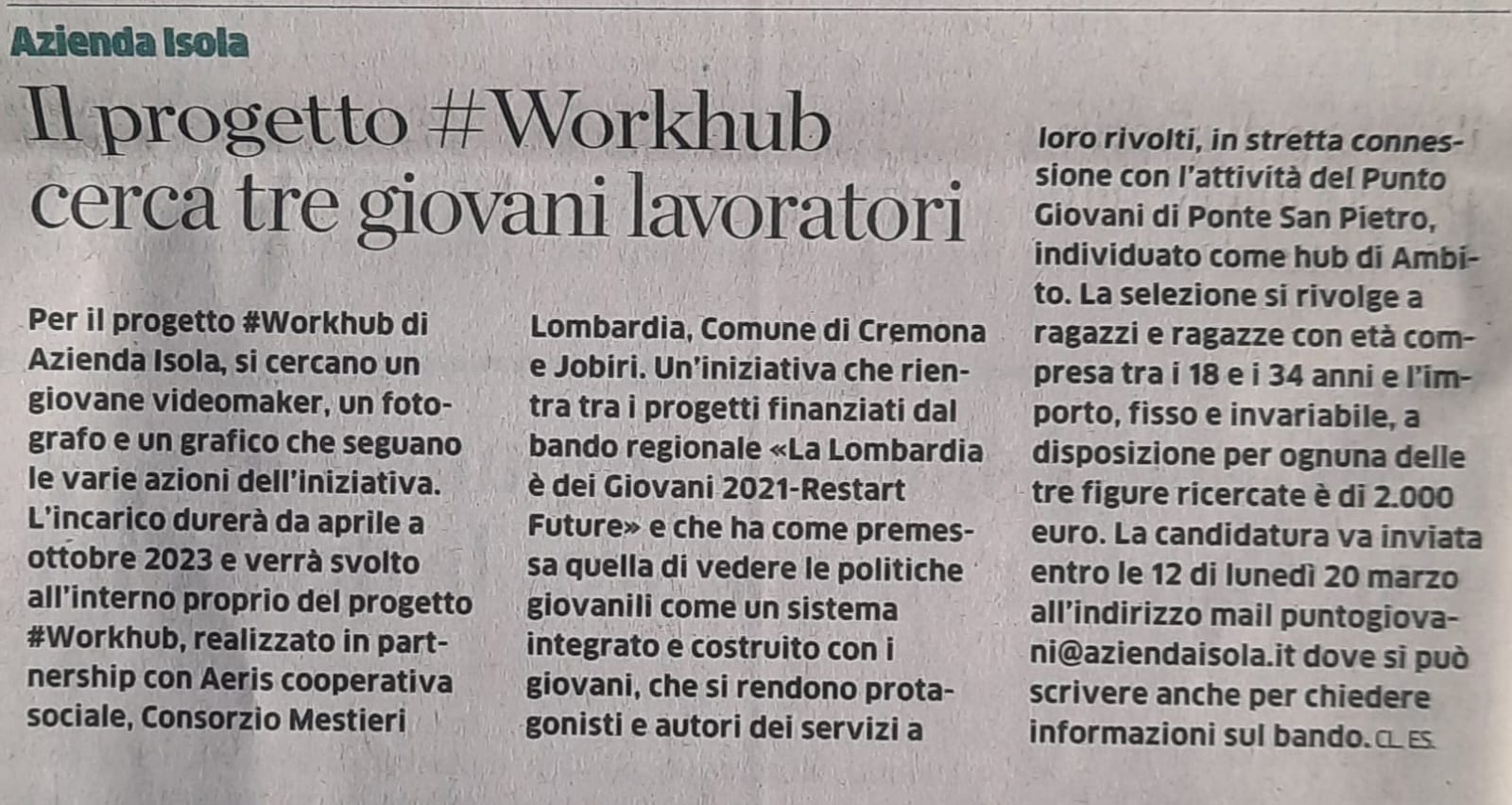 Ulteriori informazioni possono essere richieste inviando una mail a puntogiovani@aziendaisola.it