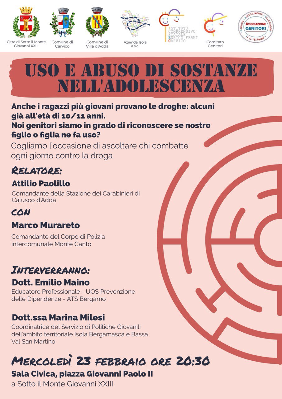 Serata formativa/informativa "USO e abuso di sostanze nell'adolescenza" mercoledì 23 febbraio ore 20,30 Sala Civica di Sotto il Monte Giovanni XXIII° Piazza Giovanni Paolo II
