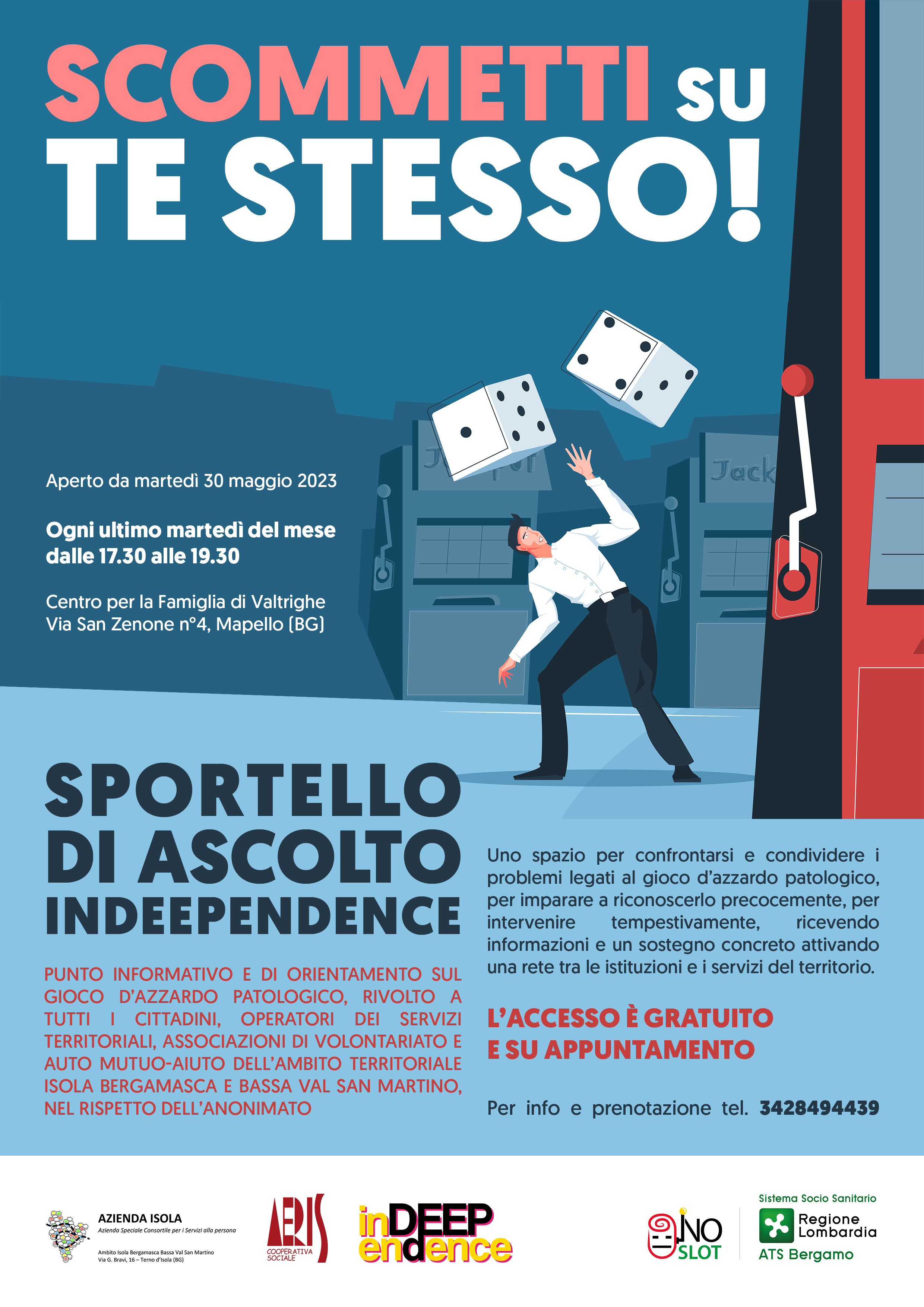 Punto informativo e di orientamento sul gioco d’azzardo patologico, rivolto a tutti i cittadini, operatori dei servizi territoriali, associazioni di volontariato e auto mutuo-aiuto dell’Ambito Territoriale Isola Bergamasca e Bassa Val San Martino, nel rispetto dell’anonimato