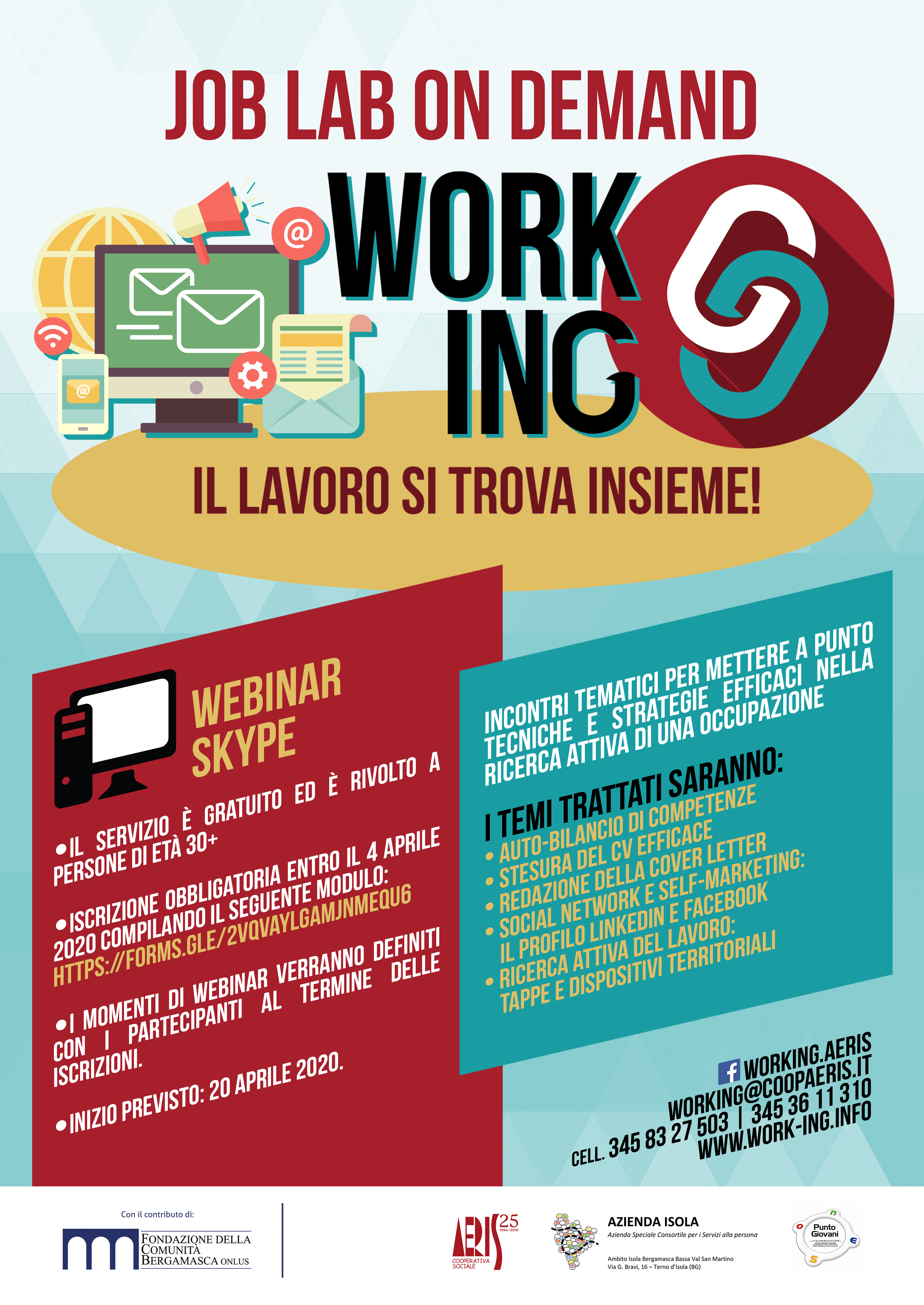 24 marzo 2020MAR242020WORKING - Job Lab on demandJOB LAB ON DEMAND il lavoro si trova insieme incontri tematici per mettere a punto tecniche e strategie efficaci nella ricerca attiva di una occupazionelocandina<<< ... 457458459460461462463464465 ... >>>